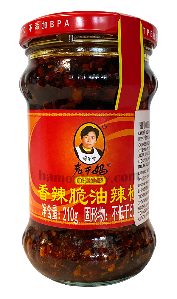 Соус Lao Gan Ma до країв наповнений сушеним чилі і хрумкою смаженою цибулею в багато ароматизованій олії. LGM або Lao Gan Ma - найвідоміша марка олії чилі, що використовується в Китаї.