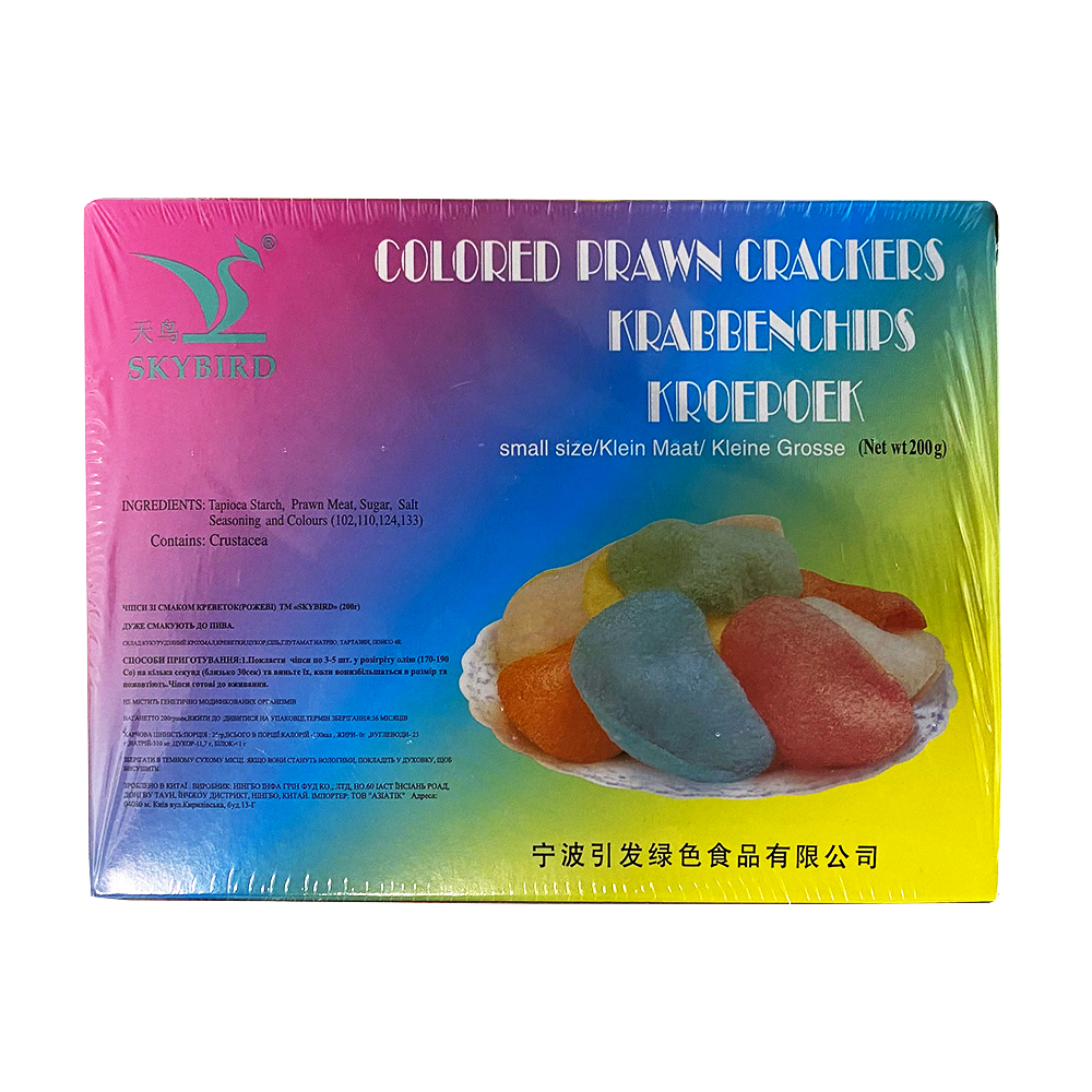 Склад: крохмаль тапіоки, м'ясо креветки, цукор, сіль, приправа, барвник (102, 110, 124, 133).