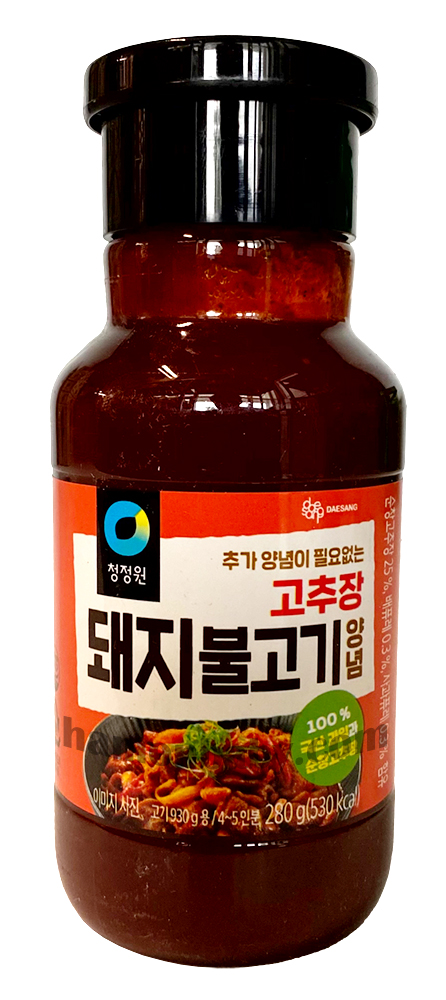 Склад: фруктоза, паста з червоного перцю, борошно пшеничне, приправа з червоного перцю, сіль, вода, заварний соєвий соус, соєві боби знежирені, L-глутамат натрію, цукор, часник, імбир, екстракт дріжджів, грушеве пюре, яблучне пюре, ксантанова камедь, регулятор кислотності, екстракт паприки, мелений перець.