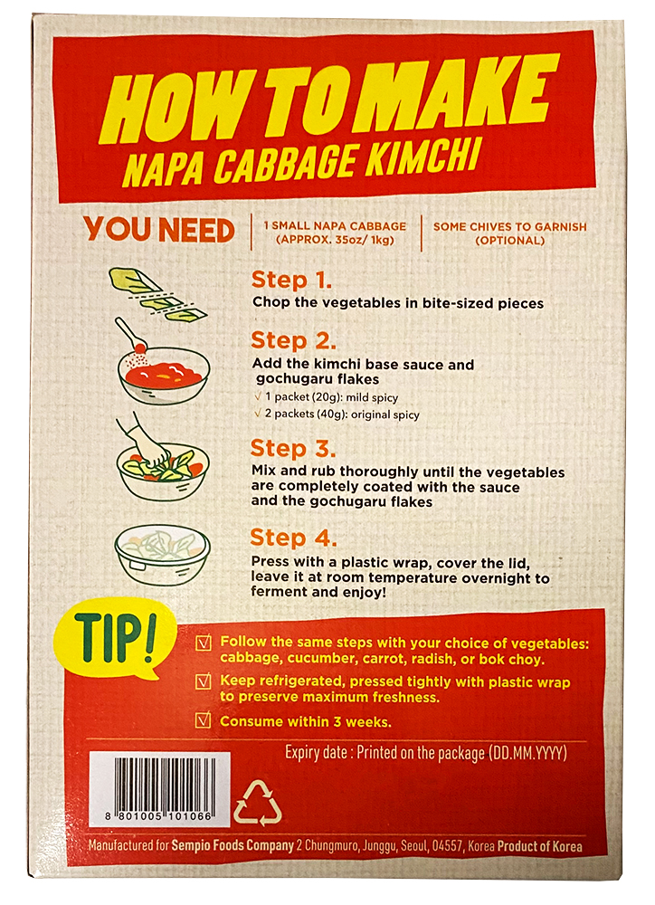 - кимчі соус основа: цибуля, креветковий соус, анчоусний соус, сіль, часник, грушеве пюре, вода, соєва приправа, бульйон з водоростей, алкоголь, фруктоза, приправа основа (цукор, глюкоза, лимонна кислота), імбир, екстракт дріжджів , модифікований крохмаль;