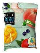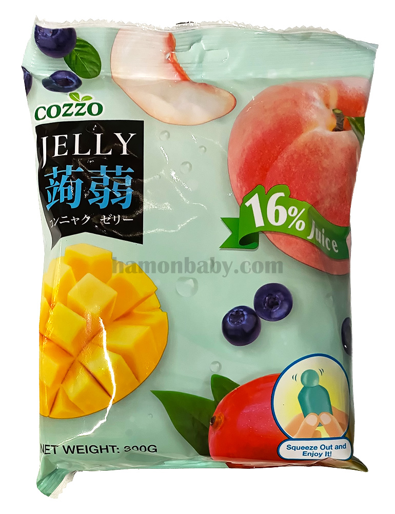 Склад: вода, цукор, сік (чорниця, манго, персик), гелеутворювач (Е407, Е425i, Е410), лимонна кислота, яблучна кислота, штучний аромат та колір (Е102, Е129, Е133).