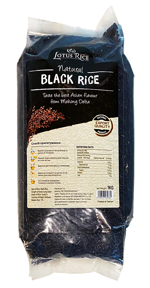 Склад: чорний довгозернистий рис. Харчова (поживна) цінність у 100 г: жир 2,87 г, вуглеводи 74,2 г, сіль 0 г, білок 9,25 г. Енергетична цінність на 100 г: 359,6 ккал.